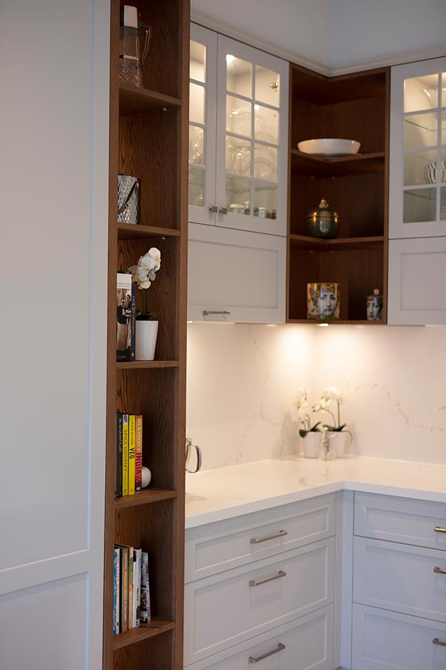 This family home in Buderim involved refurbishment of the kitchen, with the client’s brief of ‘simplified Hamptons’. The layout of half of the kitchen somewhat remained similar, making room for a new spectacular approach to a wide island bench. This bench became the feature, together with the new look cabinetry design and the colour palette. Both of which have transformed the space dramatically to achieve the fresh, grey-white Hamptons atmosphere. The existing sculptural bulkhead was also demolished to emphasize the high 3m ceilings, which helped with natural light filtering through the open planned Kitchen space. The selected white benchtop with soft grey veins provides the crisp contrast against the grey cabinetry, featuring shaker door panels and feature glazing bars. Lighting selection was also a key to this project where a mixture of recessed down light and strip lighting were specified to enhance open display shelving. The timber farmhouse shelving with back lighting illuminates the kitchen space adding warmth and texture. The textured timber elements included in the kitchen finishes selection inspired the design of a customised recycled dining table which completed the theme for the kitchen dining space.