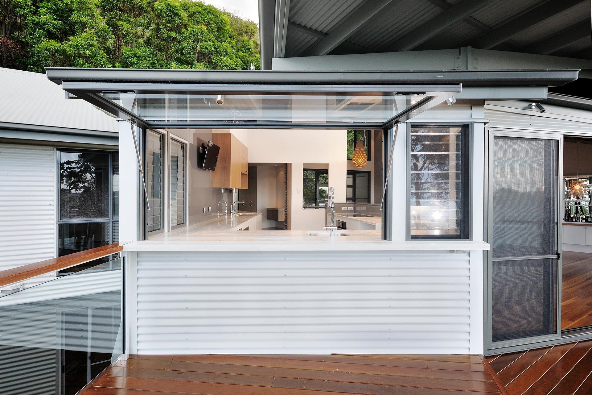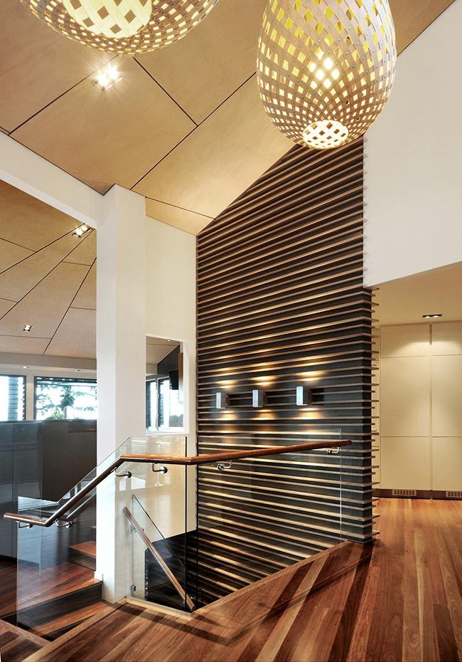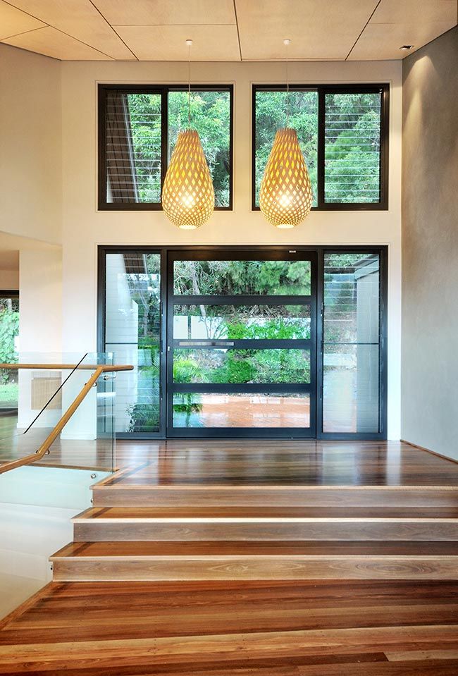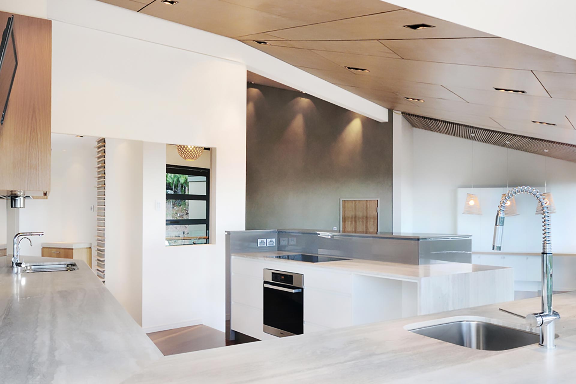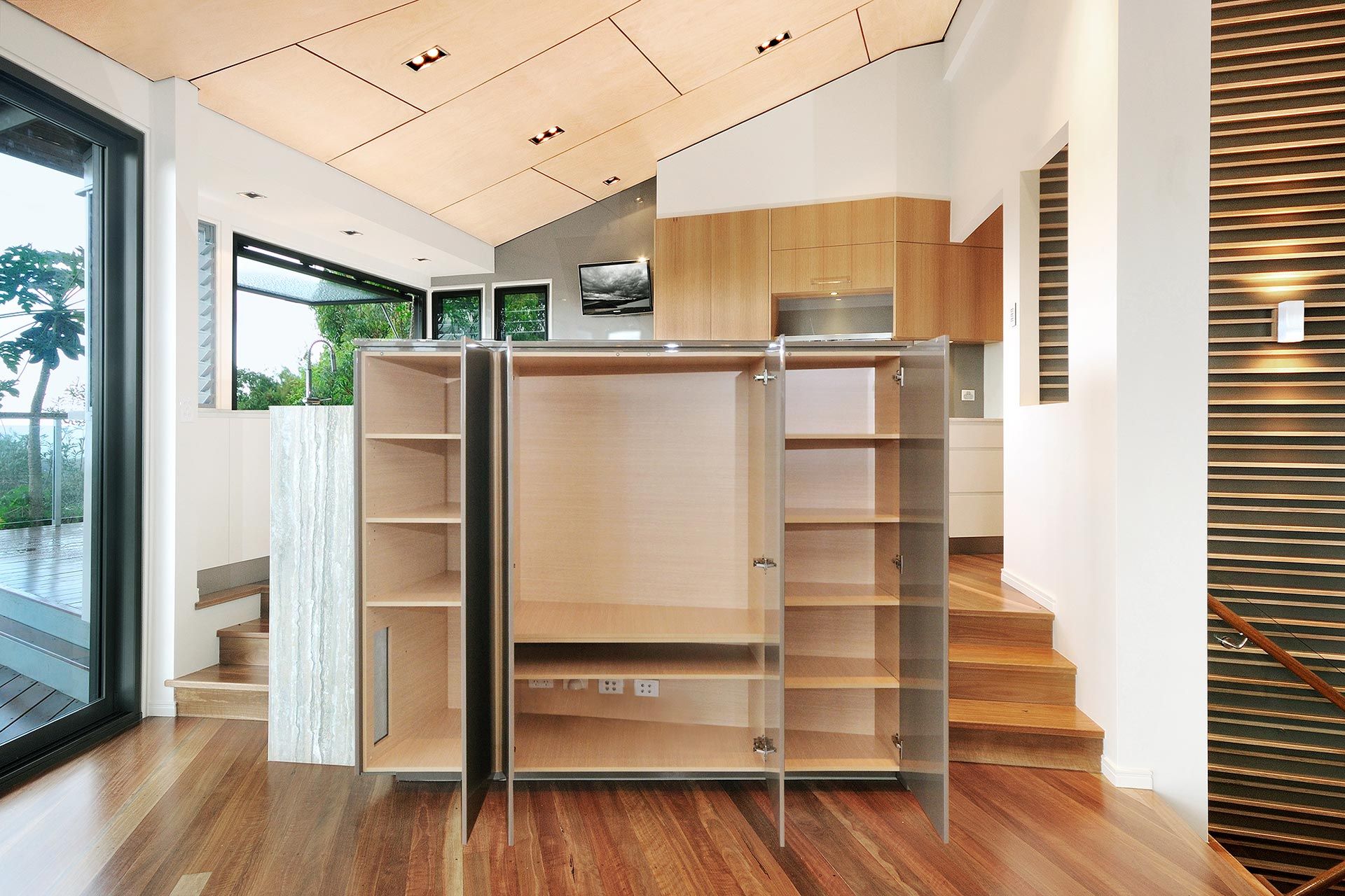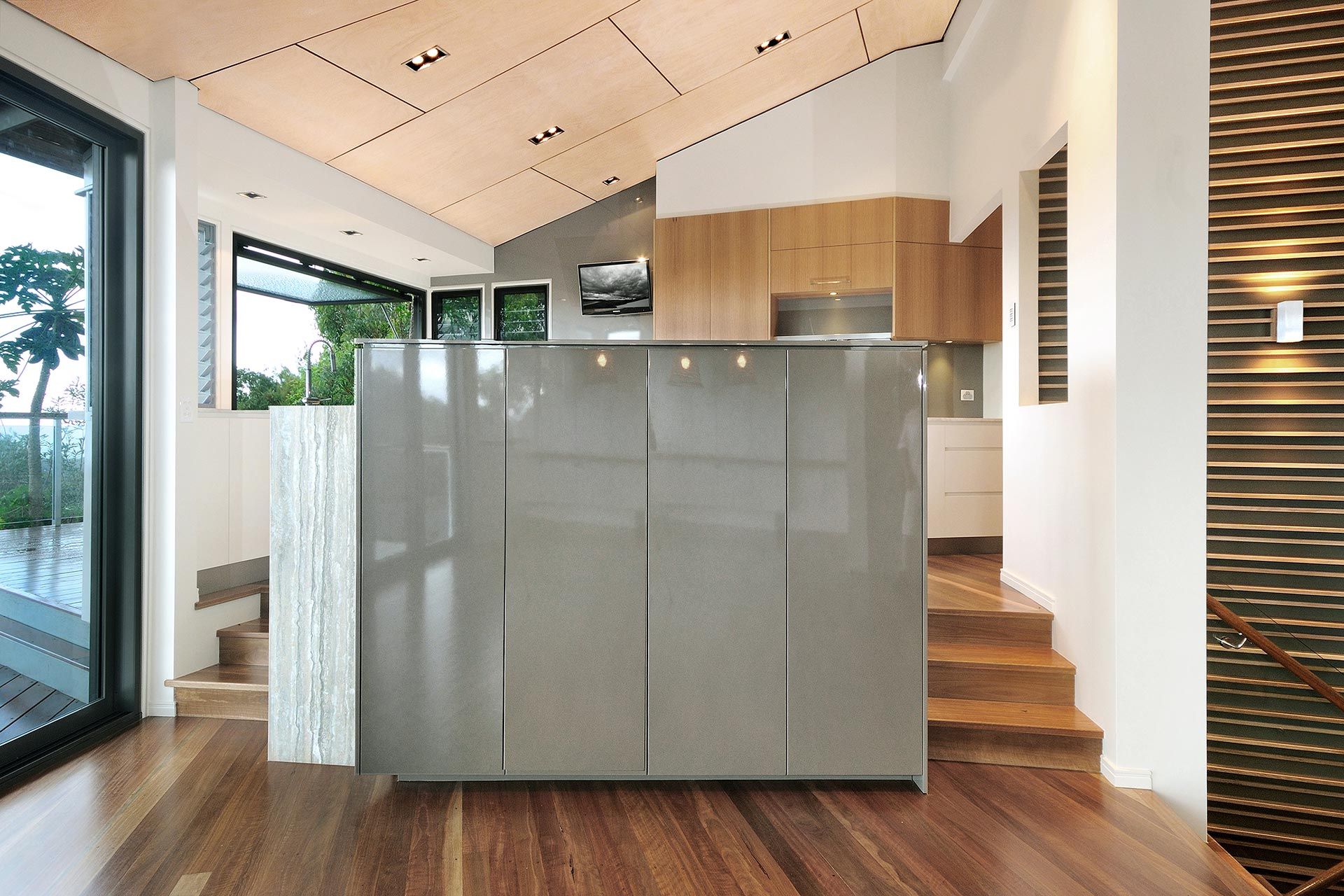 The refurbishment involved new light kitchen cabinetry highlighting the black window frames that captured the panoramic vistas out to the surrounding Coolum hillside. Introducing a light palette and light timber finishes throughout provided surfaces for natural light reflection. The Feature element was the timber battened staircase wall that included smart lighting fixtures and frameless glass balustrade. The stained ply ceiling brought a coastal appeal to the home.