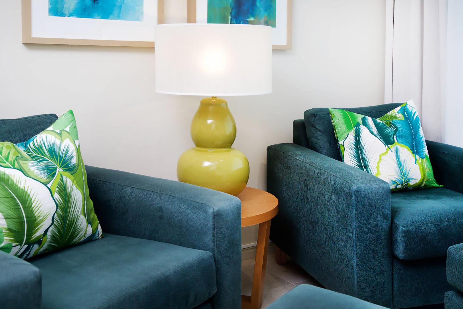 EM Interiors have created a stunning refreshed interior through the selection of artworks, lamps, and soft furnishings (cushions & bedspreads) for this apartment to uplift the interiors. New bedheads were designed with a coastal theme in mind and were upholstered in neutral fabrics to feature the cushions sitting in front. Fabrics for the feature cushions showcased striking patterns in blue and green colours, which complimented the artwork selections inspired by the coastal qualities of Mooloolaba. Selections altogether have filled the existing spaces with lively energy that the apartment was lacking previously.