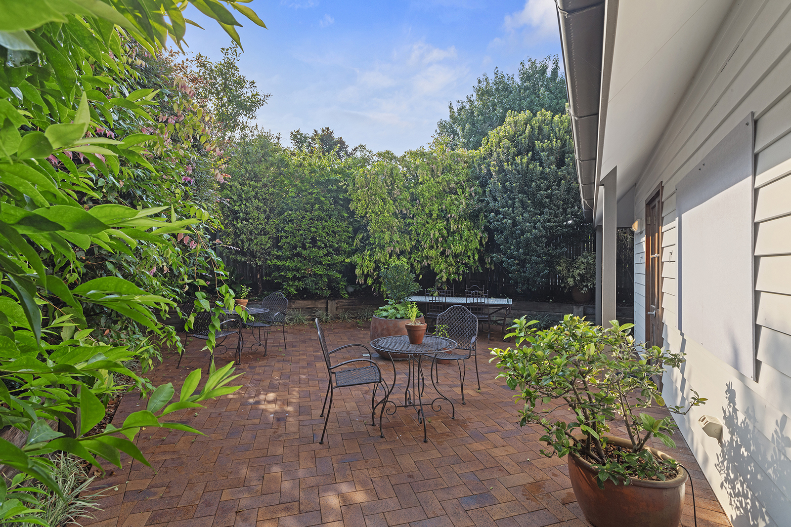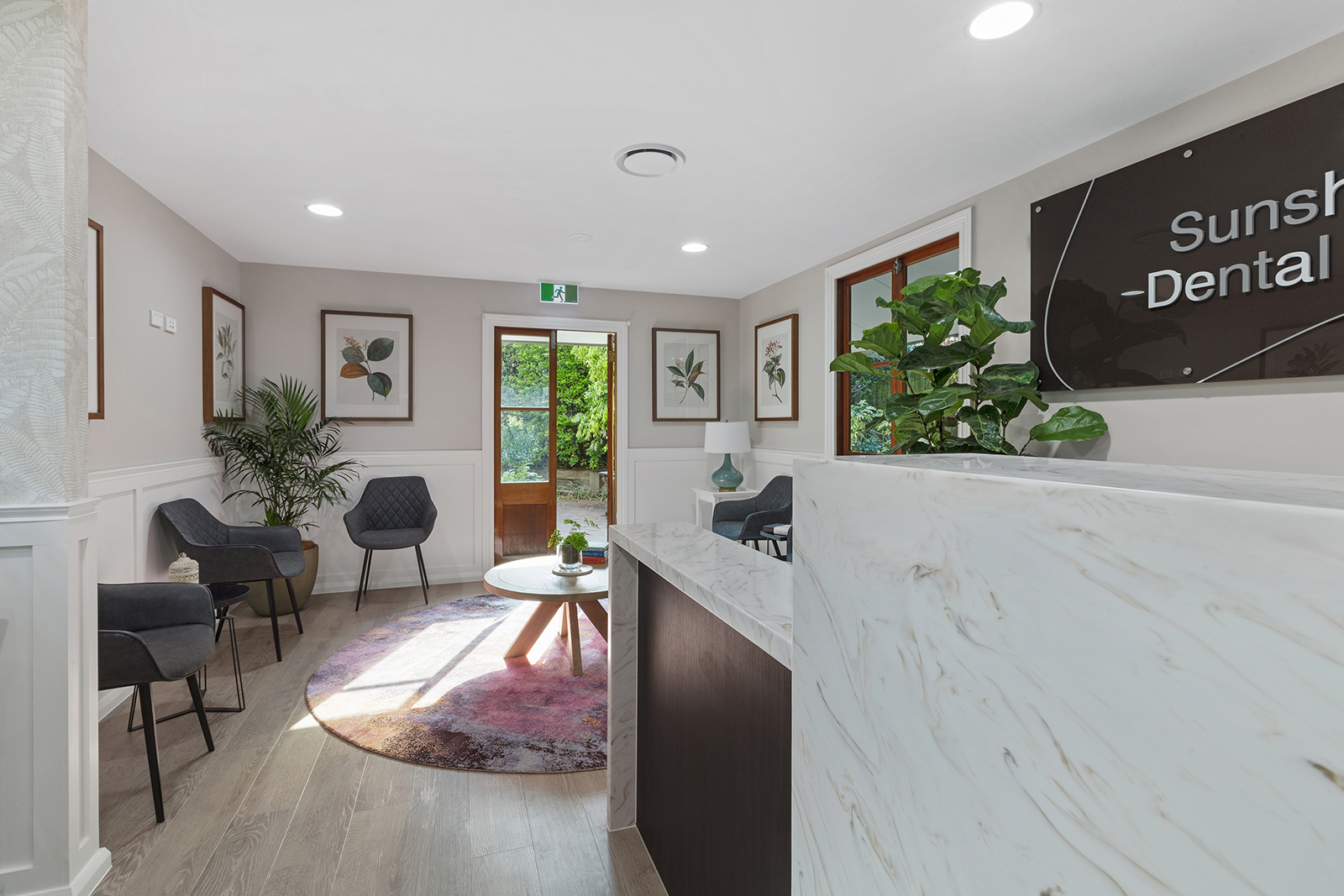 Our client approached us to assist in transforming the interior of their new Dental Clinic in Buderim. The existing building featured traditional balustrades and timber detailing which the client wished to acknowledge within the interior. Our design team saw an opportunity to create a warm and inviting reception area with the addition of Wainscotting and the selection of a feature floral wallpaper. Furniture selections supported the comfort of the patients with carefully considered weathered oak and walnut accents. Selections of exterior furniture and carefully considered planting helped to transform the courtyard into a relaxing sitting area for both staff and patients alike. The final outcome subverts the traditional expectations of clinical facilities and evokes the care our client has for their patients.