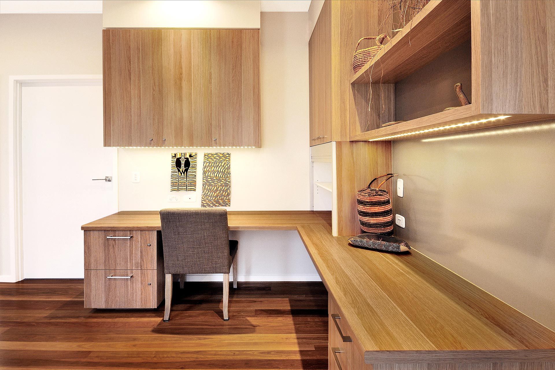 After living in the outback for several years and gaining an appreciation of a practical lifestyle and a good sense of simplicity, these clients requested a casual yet luxurious home that embraced finishes linking back to the urban mountainside location. Timber elements were used in the kitchen and repeated throughout the home to enhance a natural style and an element of warmth. A distinct connection can be seen between the natural style and artistic artefacts from the outback.
