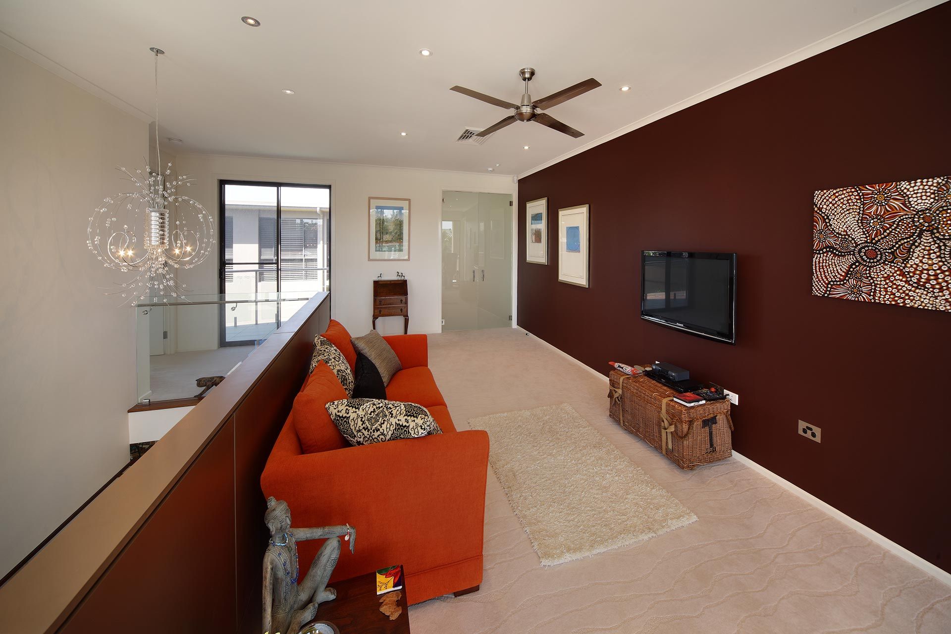 The house was designed with a concealed entry that provided for a wide glass frameless entrance door the allowed light penetration into the foyer space. We specified a forged brass entrance handle that was an art piece on its own. The Kitchen design included a generous butler’s pantry that provided for preparation and plating up during family gatherings and functions. Included is a feature staircase clad in Axolotl decorative metal finish creating statement in the center of the home. The selection of furniture had to fit within the constraints and complemented the client’s preferences for a warm colour palette. Oriental colours and patterns were introduced through the upholstery selection, that linked to the reds and chocolate browns within the interior finishes’ selection. The upper lounge area featured a pendant light that was suspended over the staircase. The house extended to a Master Suite and various bathrooms. A study was fitted out on the upper level overlooking the canal.