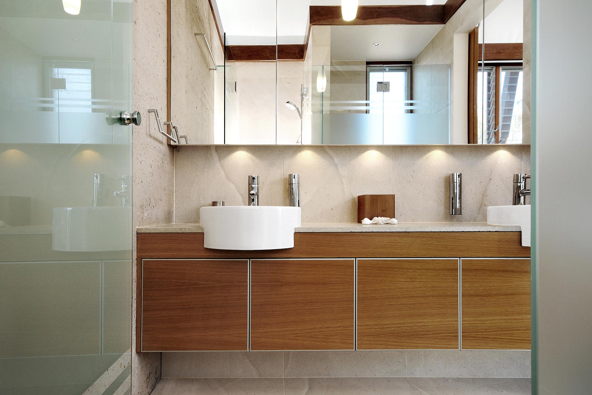 This beautiful coastal home is the epitome of a beach house. Built right on the foreshore, this beautiful home speaks volumes of coastal living. Interiority was engaged to provide interior design services including Bathroom cabinetry design, plumbing fixtures selection as well as specification of an interior colour scheme. The concept behind the selections was to emphasize the integral truth of each of the materials. Exposed veins from the floor tiles and benchtops, natural aggregates from the concrete walls, and subtle patterns from the stained plywood all come together creating a simple and earnest use of materials to enhance their natural qualities.